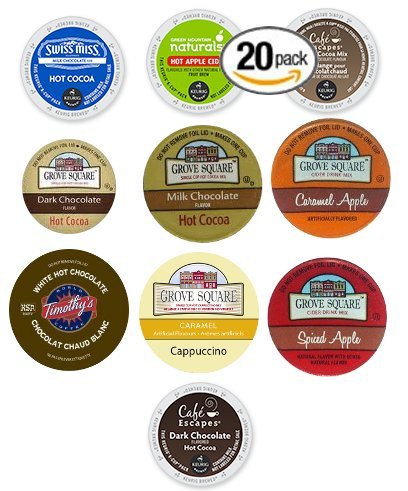 20-count Single Serve Brewer Cups for Keurig Compatible Brewers Cocoa Chocolate and Cider Variety Pack 10 Different Flavors Featuring Green Mountain Apple Cider, Grove Square Caramel Apple Cider, Grove Square Spiced Apple Cider, Cafe Escapes Milk Chocolate, Cafe Escapes Dark Chocolate, Swiss Miss Hot Cocoa, Grove Square Milk Chocolate, Grove Square Dark Chocolate, Grove Square Salted Caramel Cocoa, and Timothy's White Hot Chocolate Cups