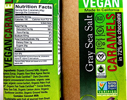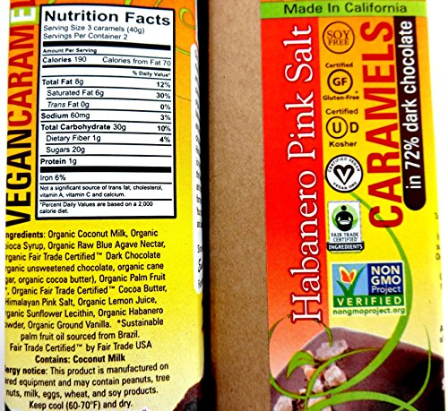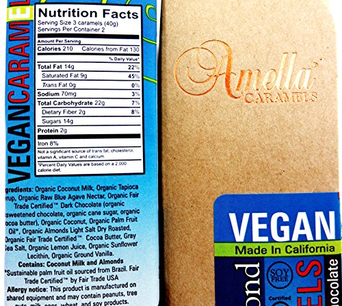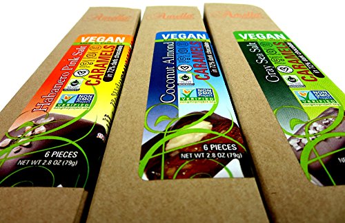 - Includes one 2.8 oz package of Amella Vegan Gray Sea Salt 72% Dark Chocolate Caramels, one 2.8 oz package of Amella Vegan Coconut Almond 72% Dark Chocolate Caramels, and one 2.8 oz package of Amella Vegan Habanero Pink Salt 72% Dark Chocolate Caramels