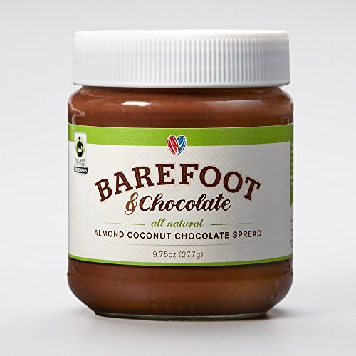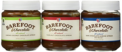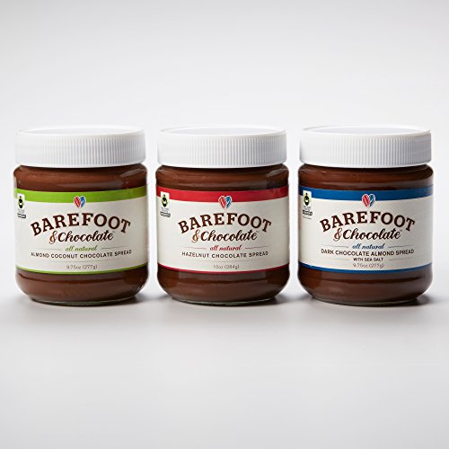 Barefoot & chocolate-selection pack-dark chocolate almond, hazelnut chocolate, almond coconut-chocolate spreads-3 jar pack (9.75oz dark almond, 9.75oz almond coconut, 10oz hazelnut). Super premium chocolate hazelnut, almond coconut chocolate, and dark chocolate almond spreads. Created with fairtrade and natural: cocoa, cane sugar and vanilla. Item certified by fairtrade usa. Non-GMO task verified, no hydrogenated oils, trans body fat, preservatives or artificial ingredients. Above 50 % more nuts and twenty % less sugar than the leading chocolate spread.