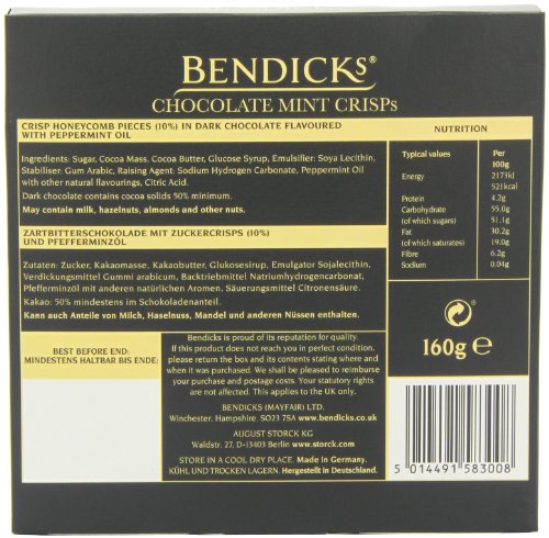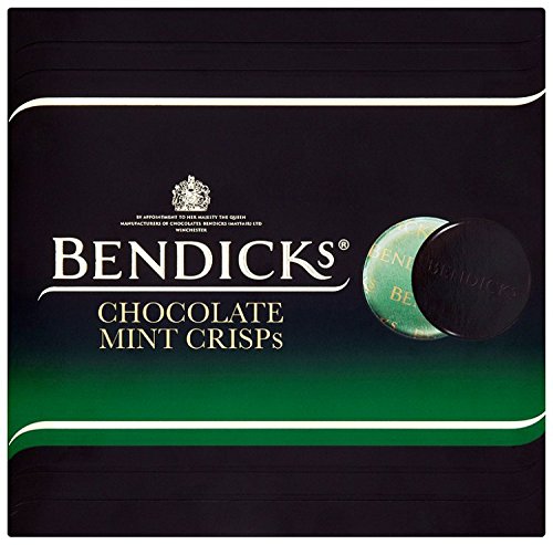 Chocolate Mints Bendicks - Chocolate Mint Crisps - 160g Considering that the growth of the Bittermint in 1931, Bendicks has spent above 80 years generating Chocolates that deliver the best finishing touch to any meal or entertainment event. The Bendicks assortment is a premium variety of dark mint chocolates, that will impress the most ardent of chocolate fans. Wherever you may possibly be and what ever you may possibly be doing, Bendicks mint chocolates are the ideal finishing touch to any meal or entertainment occasion. Handmade honeycomb pieces embedded in delightful dark chocolate flavoured with natural peppermint oil.  This recipe has been very carefully crafted to give you a scrumptious contrast of texture and flavour - excellent as the finishing touch to a meal. . $29.99 http://ecx.images-amazon.com/images/I/51ra6TfVPeL._SL160_.jpg