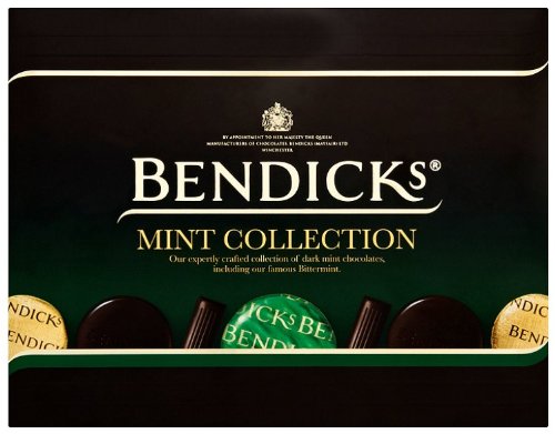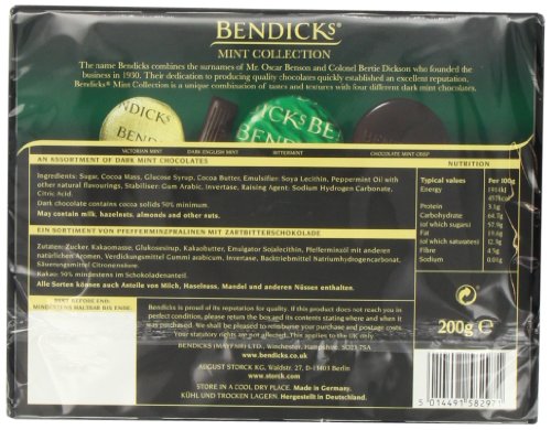 Our expertly crafted collection of dark mint chocolates, like our popular Bittermint. The identify Bendicks combines the surnames of Mr. Oscar Benson and Colonel Bertie Dickson who founded the enterprise in 1930. Their commitment to generating good quality chocolates rapidly established an superb track record. Bendicks® Mint Collection is a distinctive combination of tastes and textures with four various dark mint chocolates. AN ASSORTMENT OF DARK MINT CHOCOLATES. Our expertly crafted collection of dark mint chocolates, including our famous Bittermint. The title Bendicks combines the surnames of Mr. Oscar Benson and Colonel Bertie Dickson who founded the company in 1930. Their dedication to creating top quality chocolates quickly established an outstanding track record. Bendicks® Mint Collection is a unique combination of tastes and textures with 4 diverse dark mint chocolates. VICTORIAN MINT, DARK ENGLISH MINT, BITTERMINT, CHOCOLATE MINT CRISP. Allergy Details Allergy Other Text: May possibly have traces of Milk Contains: SoyaSoybeans Might Include: Milk, Nuts Nut Statement: Factory: Might include traces of Nuts