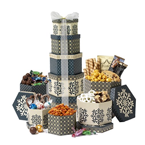 - Gift tower includes: Assorted Lindt Truffles (5pc), Milk Chocolate Covered Bavarian Pretzels (2pc), Cajun Nut Medley (4oz), Assorted Milk Toffees (3.25oz), Chocolate Covered Malt Balls (4oz), Mini Yogurt Pretzels (5oz), Pirouline Wafer Rolls (3.25oz), Bellagio White Chocolate Cocoa (1.25oz), Assorted Flavored Biscotti (2pc), Chocolate Dipped Peanut Squares (3oz), Gourmet Caramel Popcorn (3oz)