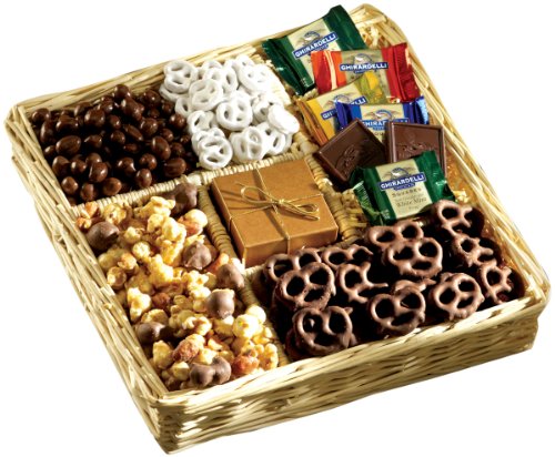 - Gift Tray includes: chocolate enrobed nuts, yogurt pretzels, almond pecan caramel popcorn, Bavarian pretzels smothered in chocolate, Ghirardelli chocolate squares, and chocolate covered nuts.