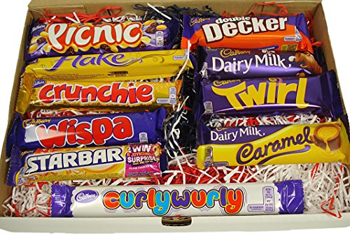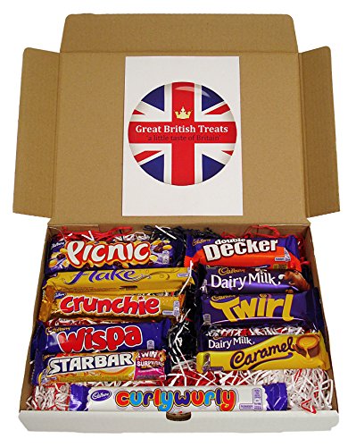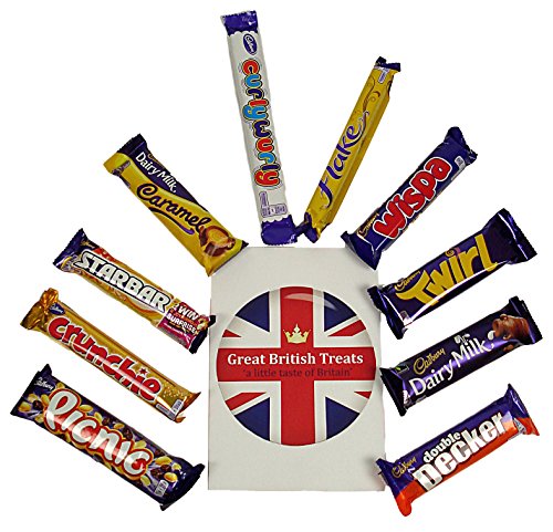 A amazing choice box of ten of the leading offering British Cadbury chocolate bars All chocolate bars are total size Uk items, not to be confused with the smaller sized size multi-pack bars. Buy now and get \'a minor taste of Britain\' delivered to your door direct from the United kingdom. In this \'Great British Treats\' selection box of British Cadbury chocolate bars you will obtain:- •1x Picnic bar •1x Flake bar •1x Crunchie bar •1x Wispa bar •1x Star bar •1x Curly Wurly bar •1x Double Decker bar •1x Dairy Milk bar •1x Twirl bar •1x Caramel bar Please constantly study the person chocolate bar labels for full components prior to consuming.