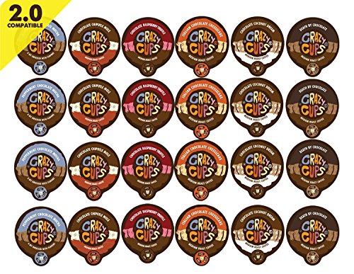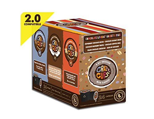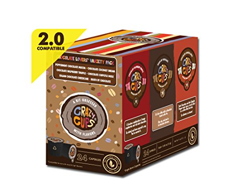 This Chocolate Lovers\' flavored Coffee Range pack by Crazy Cups is made up of: Death By Chocolate,Italian chocolate Cheesecake, Chocolate Raspberry Truffle, Chocolate Chipotle Mole, Chocolate Coconut Dream, Peppermint Choclate Mocha13 grams of coffee, 35% much more coffee than other k-cupsCrazy Cups are very good for the atmosphere with a recyclable cups: Use amazing-peel-recycle technologyGluten free, ou kosher certified, lactose free of charge, vegan and pareveFor use with ALl Keurig K-cup brewers Including the Keurig 2..