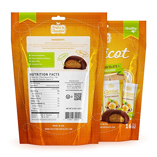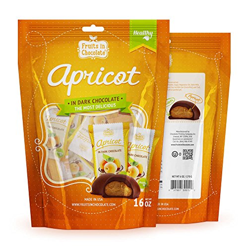 Dark Chocolate Covered Apricots, Individually Wrapped in a 16 oz Stand-Up Bag. Our luxurious combination of premium dark chocolate and the best Mediterranean apricot is simply divine! Indulge your self or surprise somebody special with this extraordinary, sweet and tangy creation! Supplying better value, our 16 oz. Stand-Up pouch is filled with 32 pieces creating it the appropriate option for snack lovers.