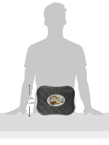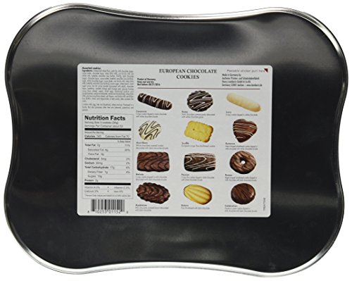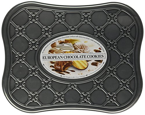 An assortment of twelve fine European chocolate cookies with Belgian chocolate presented in a decorative silver or gold tin.