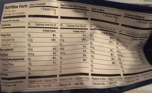 - Contains - 11 Milk & Creamy Almond, 13 Dark & Mint, 13 Milk & Caramel, 13 Dark & Sea Salt Caramel