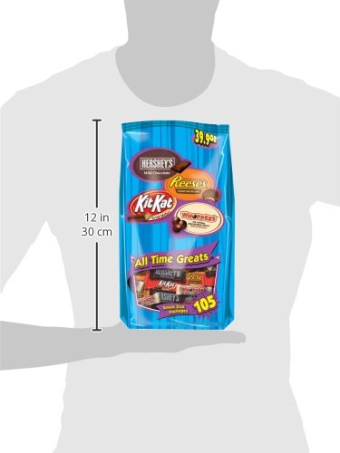 This is a 38.9 ounce, 105 piece assortment of Hershey\'s all time greats and includes kit kat, whoppers, hershey\'s milk chocolate and reese\'s peanut butter cups.