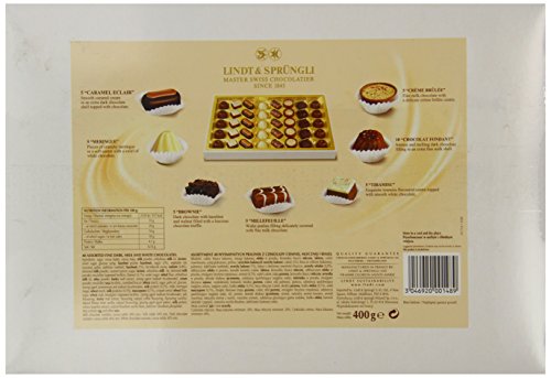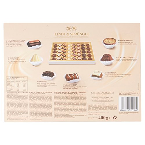 Chocolate pralines inspired by classic dessert recipes. Now featuring new and updated recipes from the Lindt Master Chocolatiers-fondant chocolate, caramel eclair, meringue, creme brulee, chocolate brownie, millefeuille and tiramisu.