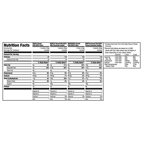 - Contains one (1) 33.9-ounce, 60-piece bag of Fun Size M&M'S Milk Chocolate Candy, Peanut M&M'S Candy, TWIX Candy and SNICKERS Chocolate Bars