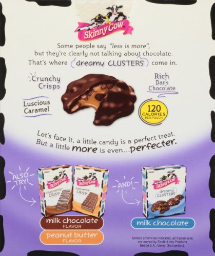 Some men and women say "less is more," but they are obviously not talking about chocolate. That's where Skinny Cow Dreamy Clusters Dark Chocolate Candy comes in. Let's encounter it. A little candy is a ideal treat. But a little more is even--perfecter. Crunchy crisps and creamy caramel drenched in rich dark chocolate--in 120 calories--it truly is like that dream the place you happen to be flying--without having the waking up part.