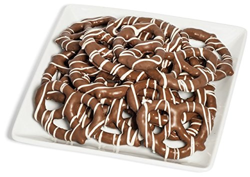 - Salty pretzels are coated with delicious milk chocolate and hand drizzled with white chocolate stripes on top.