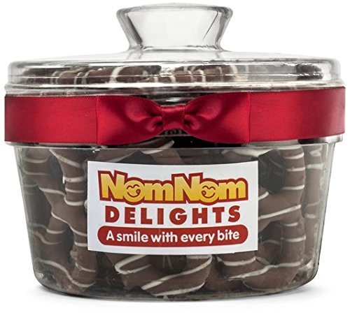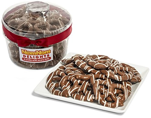 - NomNom Delights gourmet milk chocolate pretzels are decadently sweet and savory with a smile in every bite! Each gift box is 1 pound.