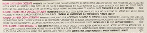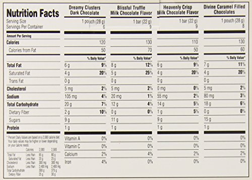 Dark chocolate blissful truffle (9 candy bars). The other flavors still incorporate - milk chocolate heavenly crisp (9 candy bars) caramel divine filled chocolate (eight pouches with 3 candy pieces).