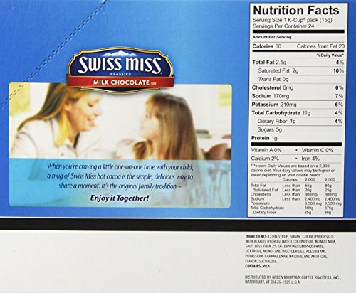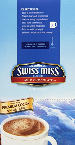 K-cup cocoa. Swiss miss milk chocolate cocoa mix is manufactured with care in a actual dairy where milk from local farms is delivered daily, dried & blended with premium, imported cocoa.