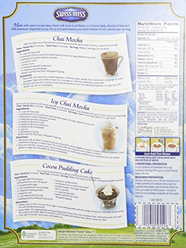 Swiss Miss No Sugar Added is the delicious way to indulge your chocolate craving while keeping your energetic lifestyle. Swiss Miss No Sugar Extra hot cocoa mix is manufactured with care in a actual dairy. Fresh milk from regional farms is delivered day-to-day, dried and blended with premium, imported cocoa. It truly is so rich and creamy, you will not think it is only 60 calories.