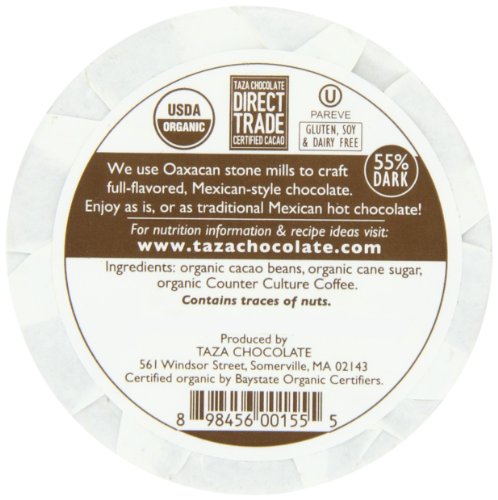 The deep chocolaty and nutty nuances of counter culture coffee\'s direct trade licensed beans marry properly with our stone ground natural Dominican cacao. To generate the ideal taste balance, counter culture customized-roasts the coffee beans just a tad darker than typical (dubbed “the taza roast”). 55% dark chocolate. Ingredients: organic cacao beans, organic cane sugar, and natural coffee. Might include traces of tree nuts and/or peanuts.