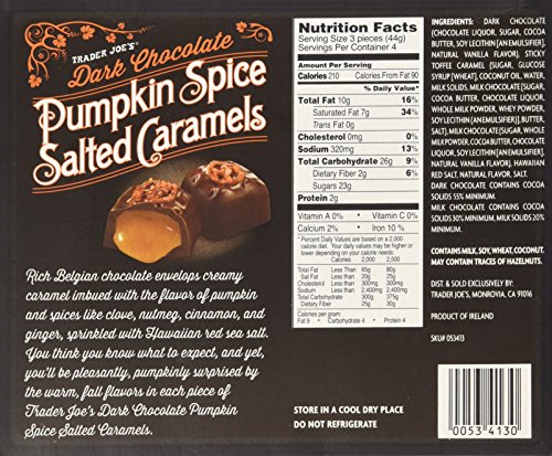 Rich Belgian chocolate envelops creamy caramel imbued with the flavor of pumpkin and spices like clove, nutmeg, cinnamon, and ginger, sprinkled with Hawaiian red sea salt. You believe you know what to count on, and but, you\'ll be pleasantly, pumpkinly shocked by the warm, fall flavors in each piece of Trader Joe\'s Dark Chocolate Pumpkin Spice Salted Caramels. Store in a cool, dry spot. Do not refrigerate. Consists of soy, milk, wheat, coconut,. May incorporate traces of hazelnuts.