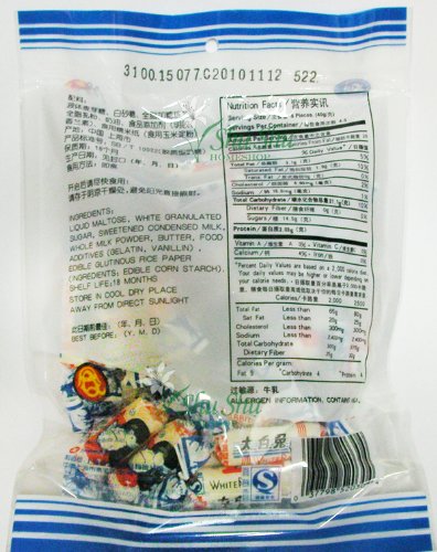 White Rabbit Creamy Candy in six.3oz (179g) package. The Super Renowned Delightful Creamy White Rabbit Milk Candy with rice papper wraping. White Rabbit Creamy Candy is white, with a soft, chewy texture, and is formed into cylinders around three cm extended and one cm in diameter, similar to contemporary western nougat or taffy. Every candy is wrapped in a printed waxed paper wrapper, but inside of this, the sticky candies are again wrapped in a thin edible paper-like wrapping produced from sticky rice. This is the original white rabbit candy, do not get baffled with golden rabbit. Item of Shanghai Guan Sheng Yuan Foods, China.and#22823and#30333and#20820and#22902and#31958