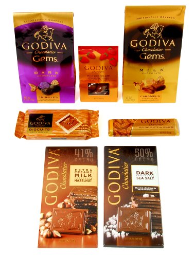 - Contains Godiva Dark Chocolate Truffles, Milk Chocolate Caramels, Milk Chocolate Dipped Strawberry Bar, and more!