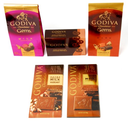 - Contains Godiva Milk Chocolate Bar, Dark Chocolate Caramels, Milk Chocolate Truffles, and more!