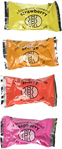 Eight individually wrapped chocolate covered marshmallow eggs in four flavors: raspberry, cherry, orange and strawberry